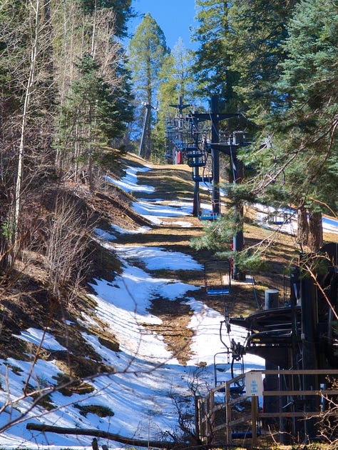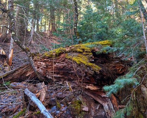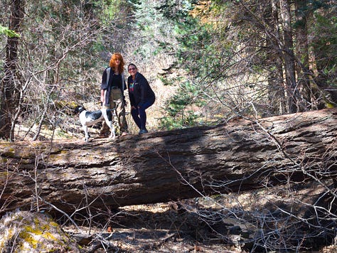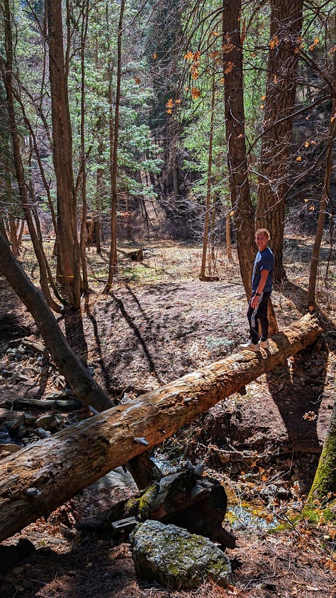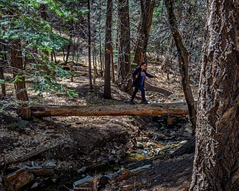The last leg of Mint Springs Loop provided a mossy trail under towering Ponderosa Pine with log bridges over a crystal creek fed by snow melt from the Ski Slope. A glorious playground to explore on our own!!