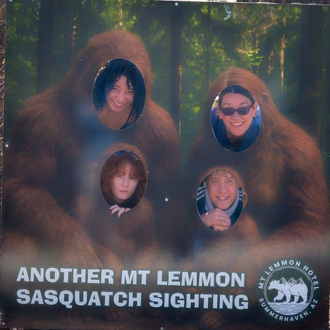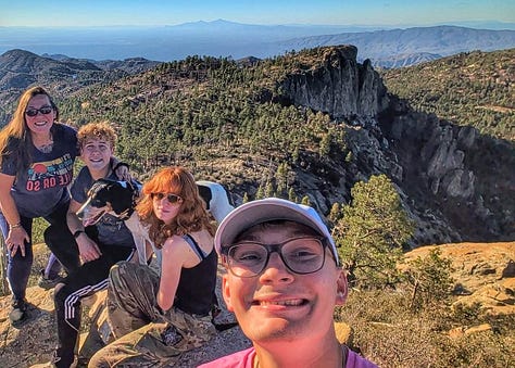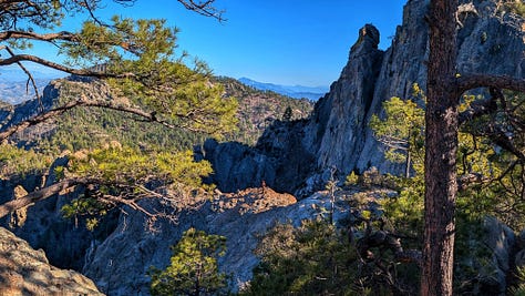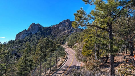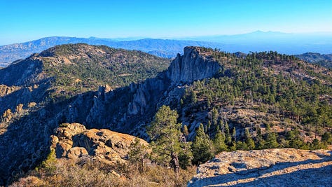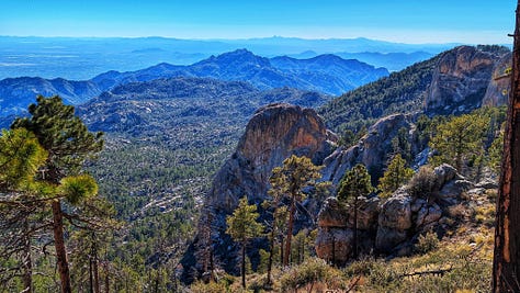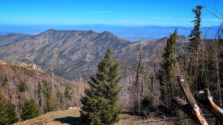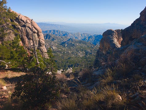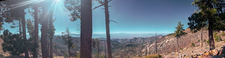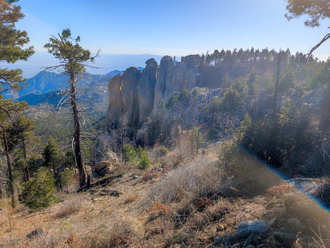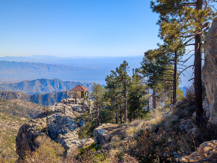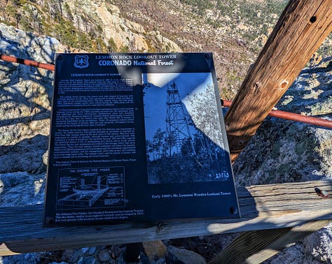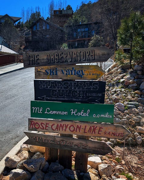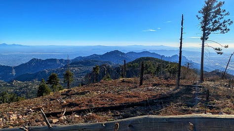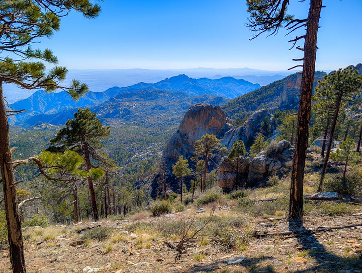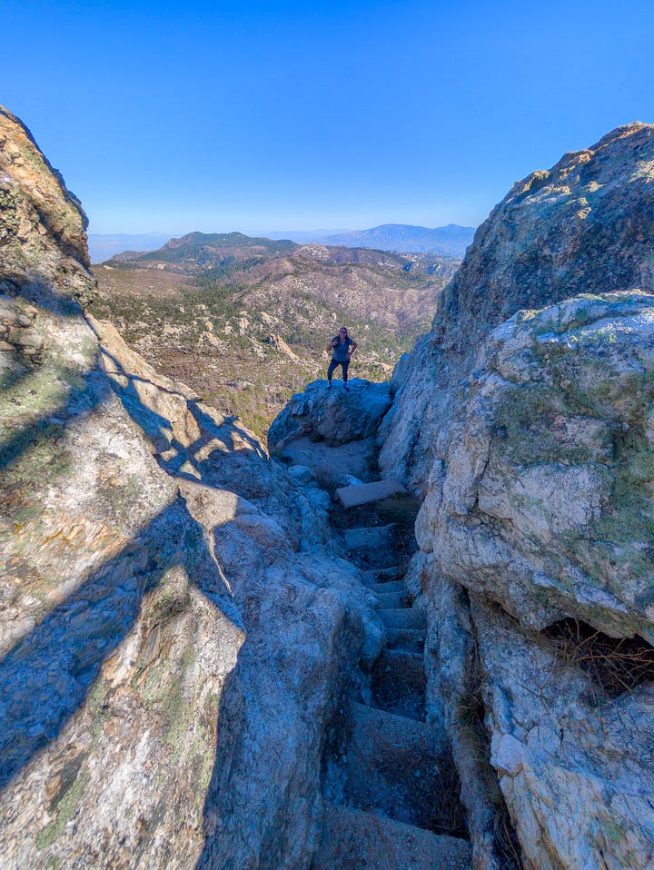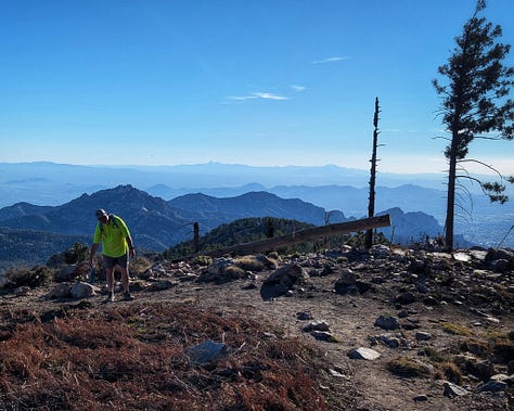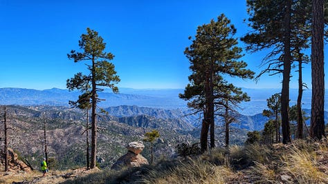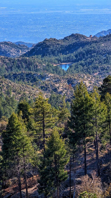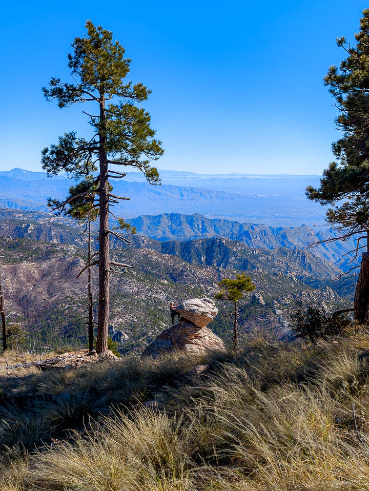 This hike was a banger from the very start. Barely into the trail, there were reasons to add extra trails on the side. On Meadow and Mount Lemmon Loop we added Lemmon Rock Lookout because the splendor was too intriguing to ignore. There were remnants of a viewing tower built in 1928, crystals bedded along an old stairway, red tail hawks and natural springs. We then passed right by the mapped junction and on to climb pillars of rocks that had excited me in the distance. Traveling back to the junction loop with only a mile or so to go, we were once again under a canopy of Ponderosas switching back to the Summit for incredible sunny views of Tucson and beyond. I can't wait to go back (not so sure Todd shares this sentiment), to go further, to see more, to take my kids and friends.... There is so much to explore, so much beauty when we are willing to see it!