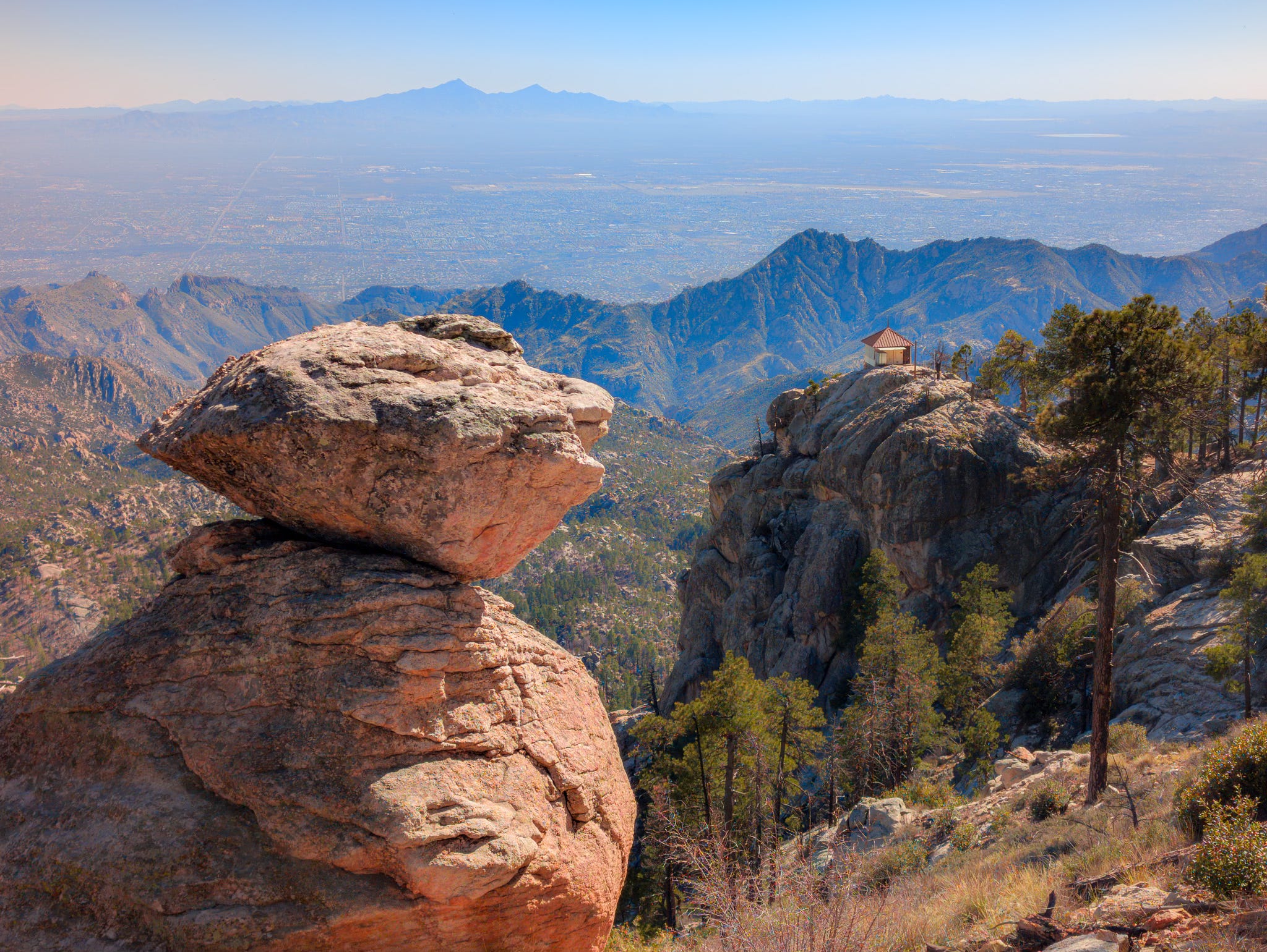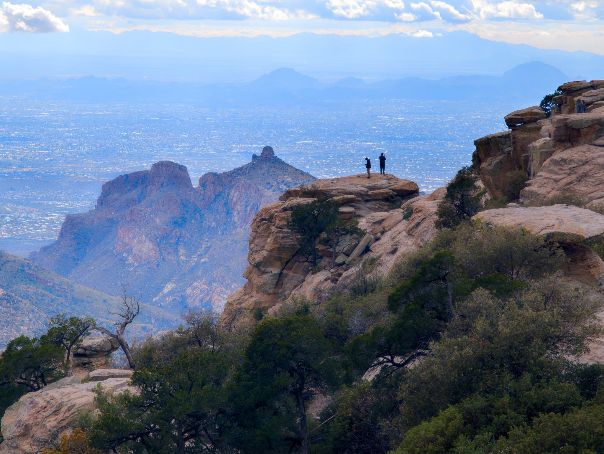 Along the way there are a number of pullouts and turn-offs for campsites and hiking trails. But the one you will want to stop at is Windy Point. There’s a parking lot and restrooms. But you can also walk right out on the edge of the rocks overlooking Tucson below.