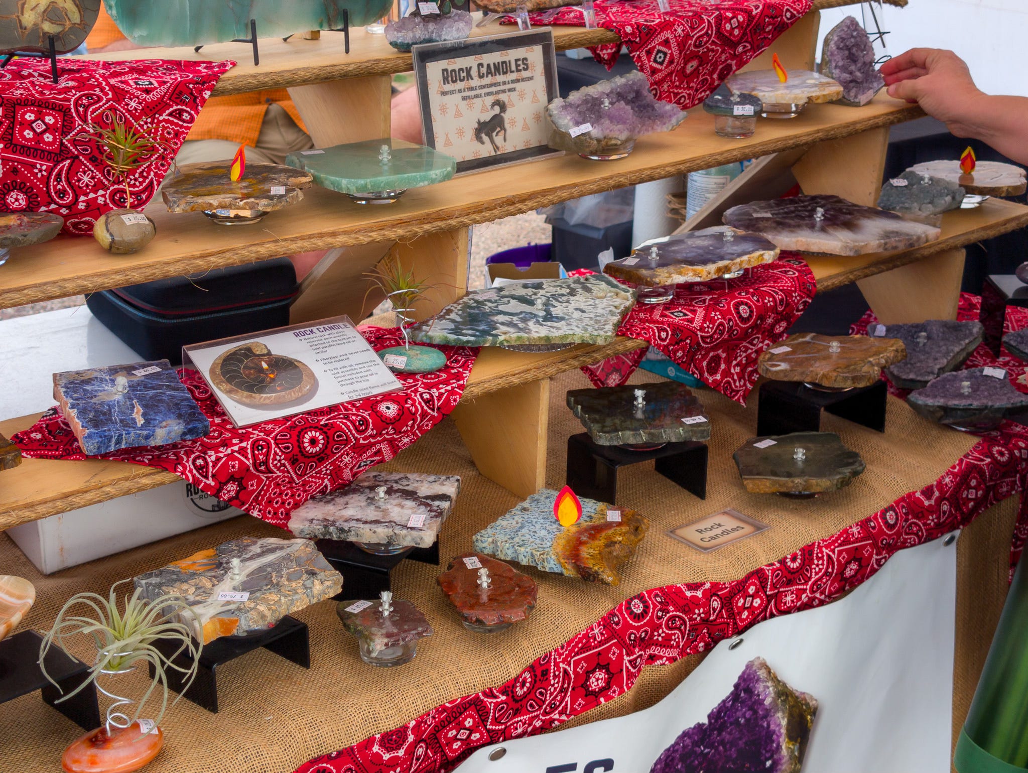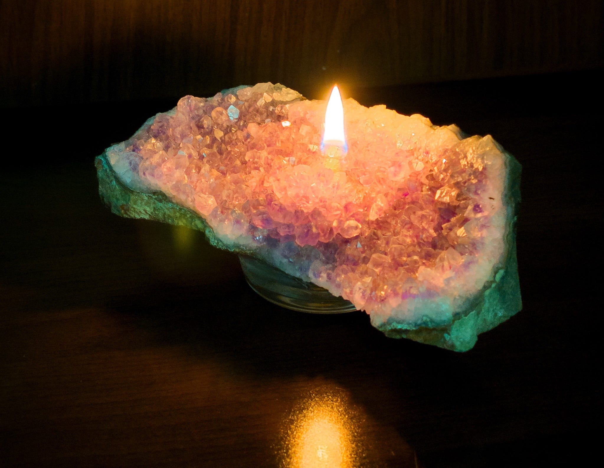 We bought an amethyst a candle for Kelly. It’s neat. There’s a hole drilled in it, then a glass reservoir that holds oil. A rope wick uses the oil to stay lit as long as the oil lasts. Theoretically, this candle should last forever.