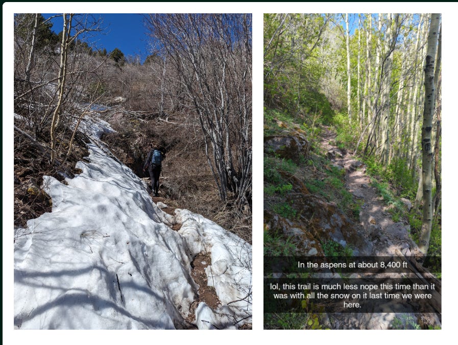 As I said above, this morning in May was actually our second attempt. About half way up Carr Peak trail, you go through this nice little section of Aspen trees. But as you can see in the pictures below, 6 weeks or so can make a huge difference in the spring. The first time we were out there in the beginning of April, it was legitimately scary slippery in a few spots. By the middle of May though, it was lush and green, and pretty. But in April, the snow through the aspens was just a harbinger of what was up ahead. Pretty sure it was at this point that we decided Miller Peak was not going to happen that day, so we would just both try for Carr (and we did).
