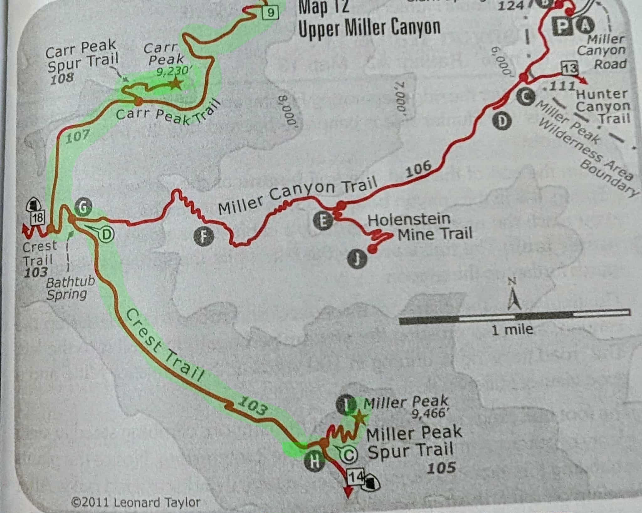 Trails: Old Sawmill Springs, to Carr Peak, to Crest Trail, to Miller Peak Spur Trail