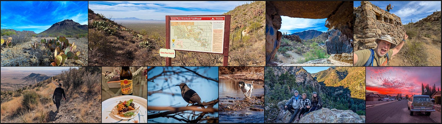 We got up and out of the house at least 4 or 5 times during the first month of the year. We hiked the first segment of the Arizona Trail, down near the Mexican border. We took advantage of the best weather of the year to visit Gates Pass and Tucson Mountain park. Put on our coats to take a visiting relative up to see the views from the Hamburg overlook in Ramsey Canyon, and even took the dog for a romp in the river. Ending things up with homemade tacos and spectacular sunsets.