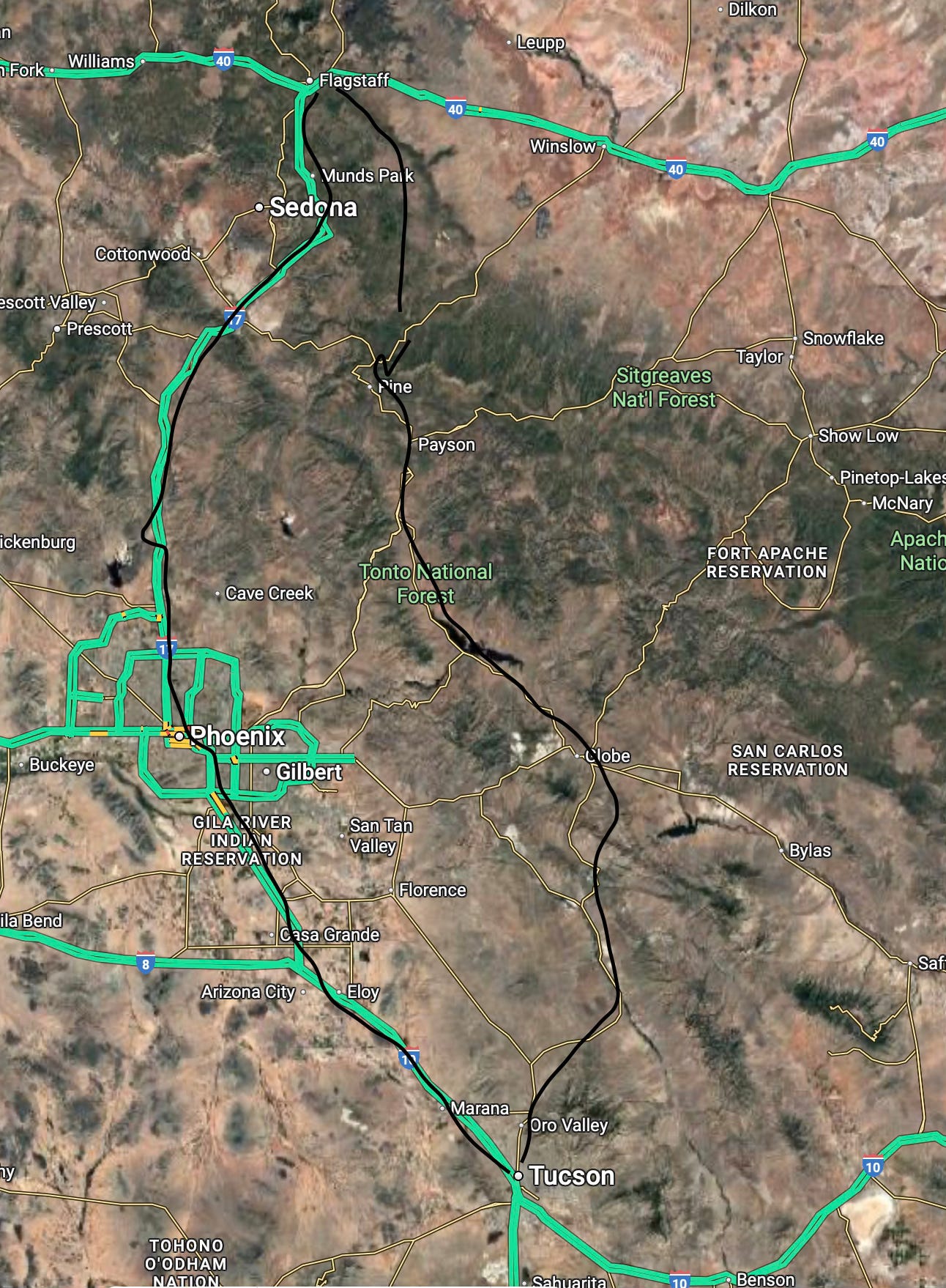 From my house in Sierra Vista, it’s a little over 5 1/2 hours to Flagstaff via the Interstate. It’s closer to 7 hours if you go through Globe, Payson, and Pine (and that’s if you don’t get stuck behind a line of pickups hauling big campers).
