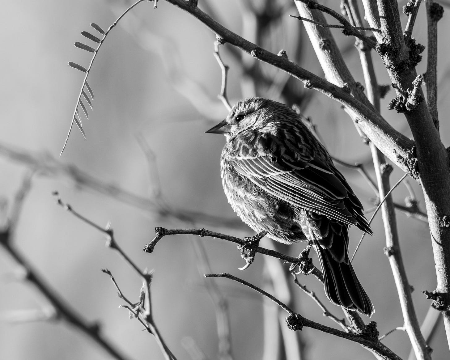 It’s not always easy to make wildlife images look good in B&W. But I think the nice contrast produced by the early morning sun in this shot of a female red-winged black bird actually worked pretty well.
