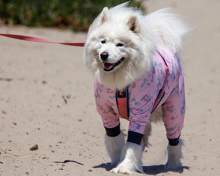 I suppose if you’re going to bring your dog to the beach, there’s no reason they shouldn’t be fashionably dressed.
