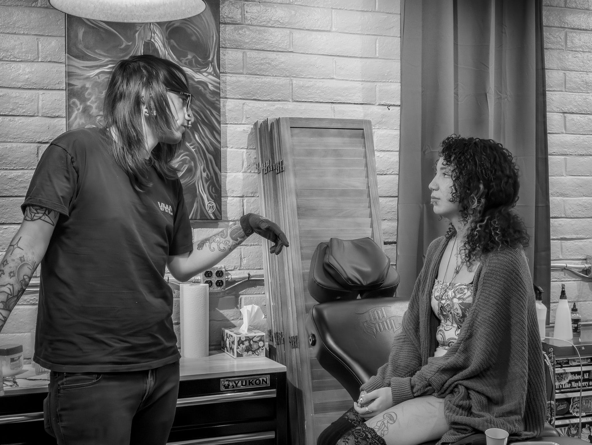My 17 year old daughter now has 4 piercings and a tattoo (the jellyfish on her leg). Today she got “snake bites” in her lower lip. There was one big difference between today and our previous trips to 12th Planet Tattoo …