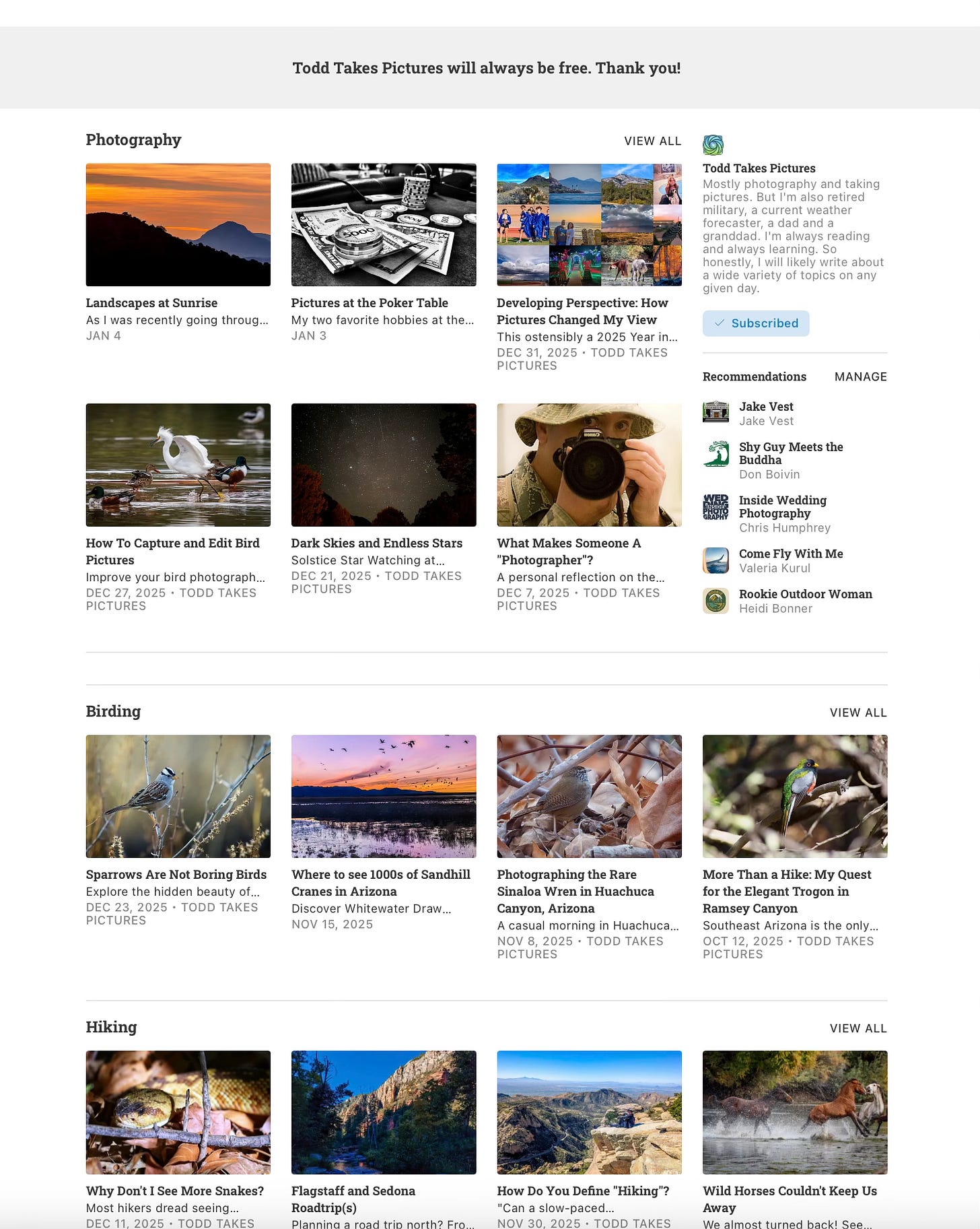 A few specific category tags for subjects you are likely to write about frequently; photography, birding, hiking, and weather in my case. Then a “catch all” tag for things that don’t quite fit anywhere else (Family & Personal). Then for me those other two categories are for posts that are going to be weekly updates.